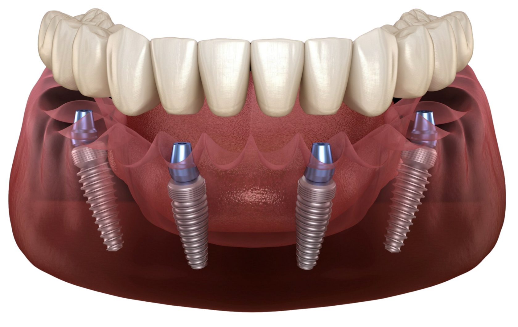 Применяется при отсутствии всех или большей части зубов. Протез надежно фиксируется на 4 имплантах и возвращает функциональность всех зубов и привлекательность улыбки.